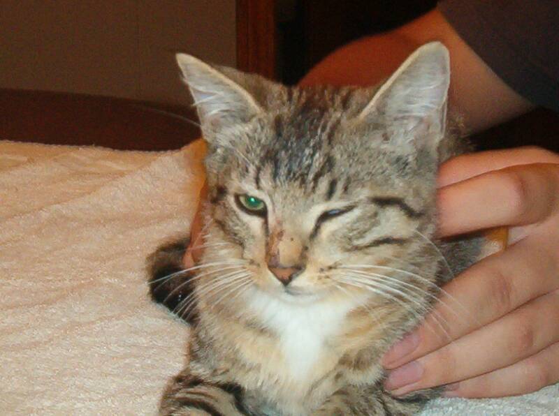 Due to chronic eye infections that are a result of fiv, his left eye looks like he is squinting all of the time. He is the most symptomatic of all of the cats. Besides the eye infections, Mr Jenkins gets ulcers in his mouth that make eating very painful. We frequently have to hand feed him bits of chicken, tuna and beef. He loves cooked carrots and beets!!