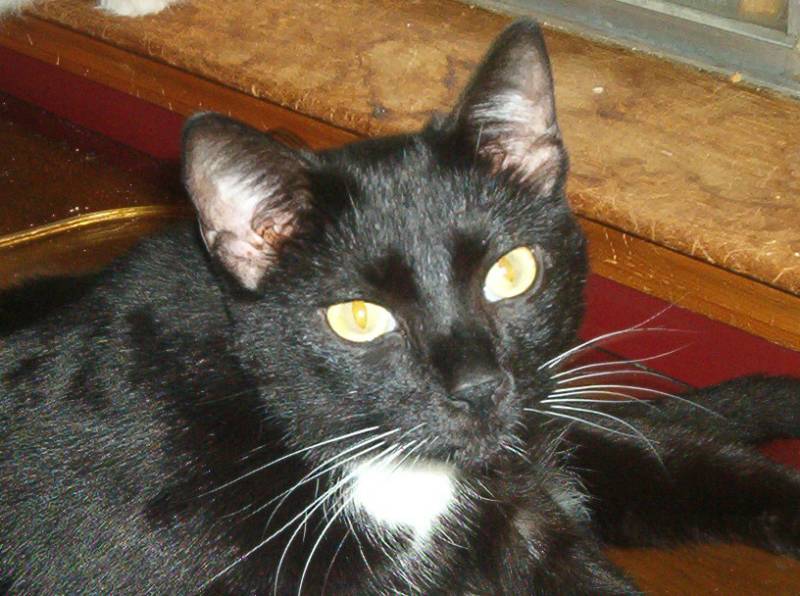 Alice is very sweet and seems to love having her picture taken. Her coat is quite unusual as the black patches are coarse and slick while her white fur is soft and fluffy. She likes Adam but not the other cats.